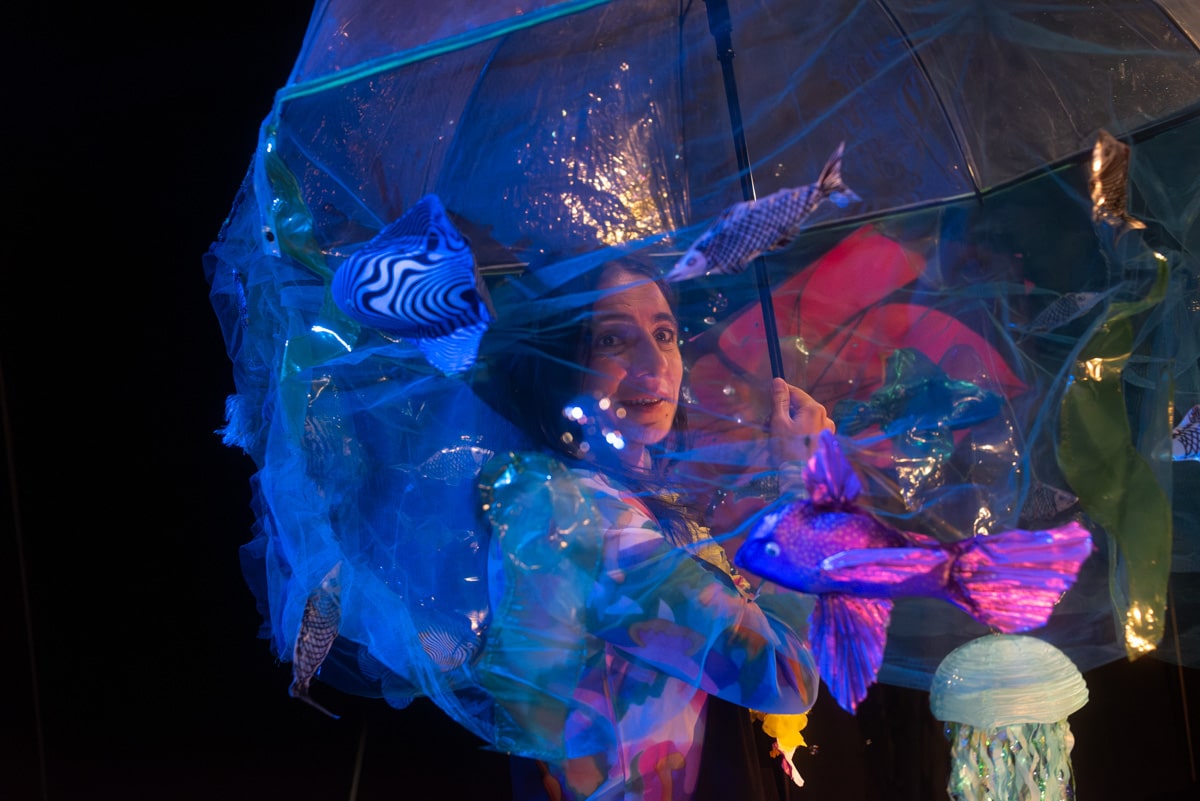 À partir d’une réalité dominée par le noir et blanc, la fillette compose une nouvelle partition où les couleurs s’accordent à ses rêves éveillés. Dans ce spectacle en technicolor, l’autrice nous propose de poser un double regard sur cette histoire de voyage, celui de l’enfant et celui de l’adulte.